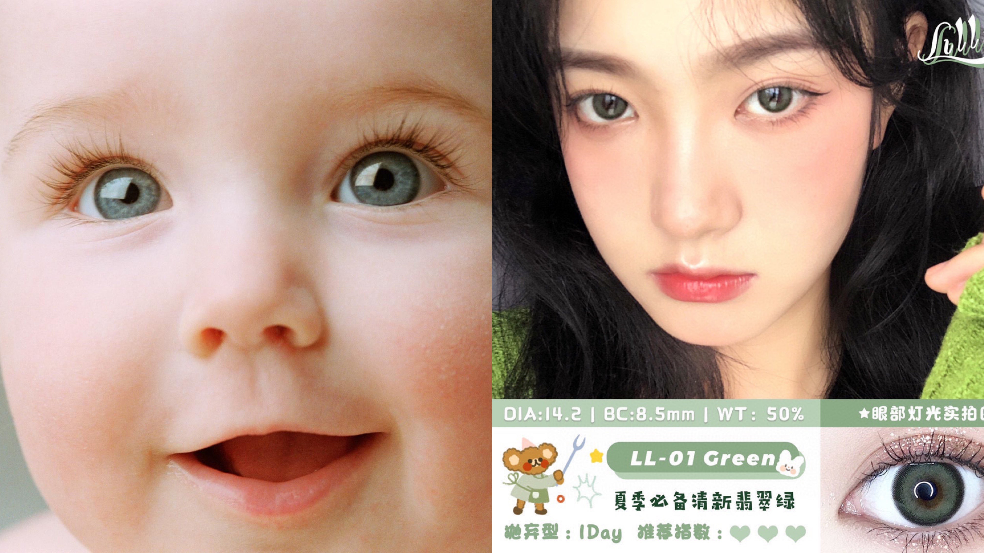 有绿色瞳色的宝宝更是特别,翡翠般的眼睛让人完全挪不开眼!但是戴上Lillilly肉肉系列的绿茵精灵就可以很轻松的打造这样的感觉--黑色的外边和碧绿的内圈非常好的融合在了一起,佩戴在眼睛上也完全不会突兀,上眼就是小精灵本尊!