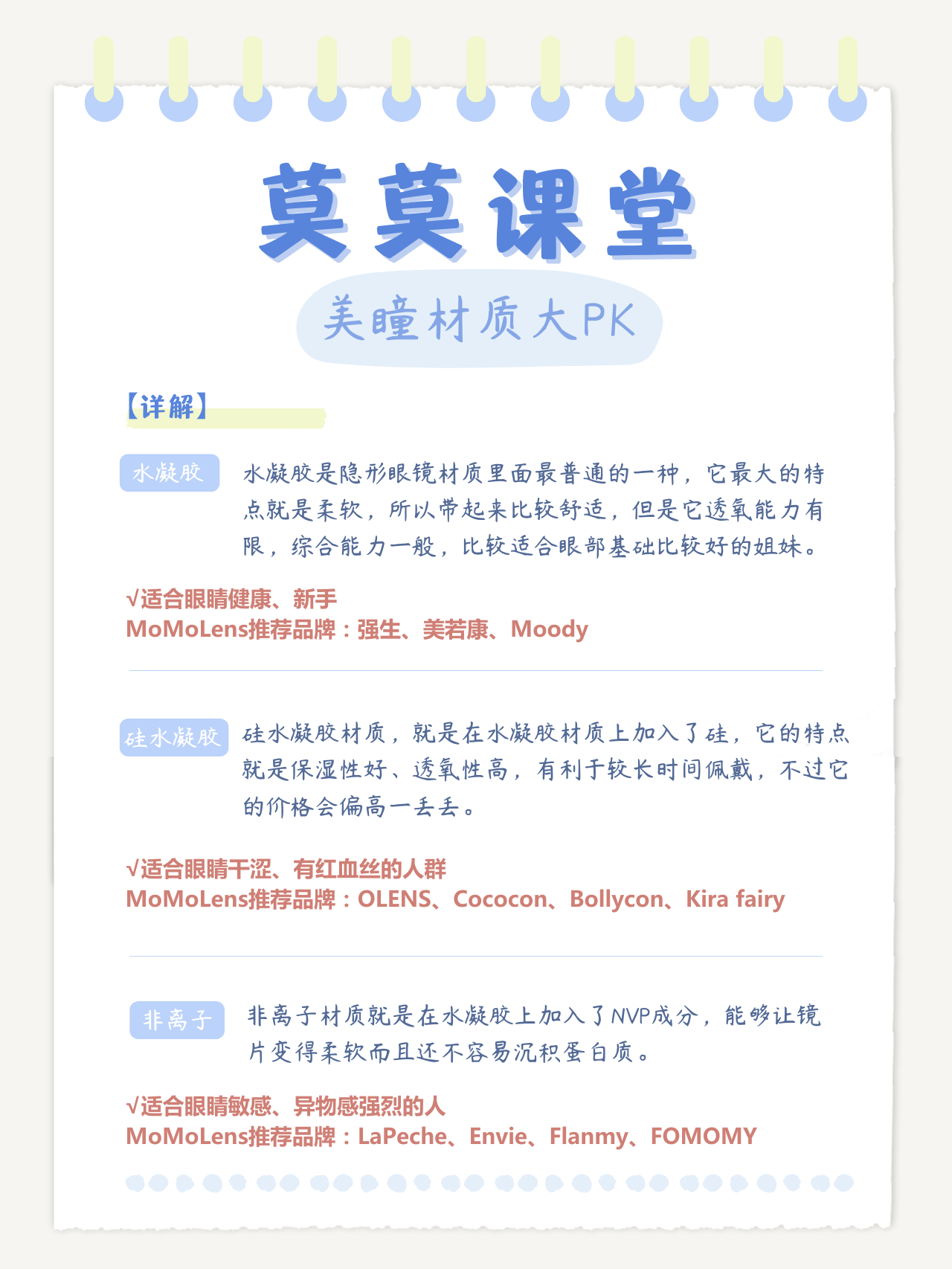 非离子材质就是在水凝胶上加入了NVP成分,能够让镜片变得柔软而且还不容易沉积蛋白质,它就是柔韧度高且舒适度优秀,就比较适合眼睛比较敏感、担心戴美瞳会有异物感的MoMo粉。虽然镜片的使用寿命也会大大的提升,但是非离子在保湿方面比硅水凝胶稍稍差点。
